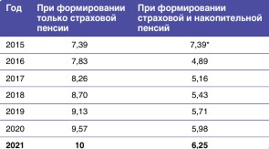 В 2014–2015 годах все страховые взносы работодателя (16%) поступают только на формирование страховой пенсии. В 2016 году 6% тарифа страховых взносов (из этих 16%) будут начисляться на формирование накопительной пенсии у тех граждан, которые приняли решение ее формировать. Кроме 16%, работодатель еще уплачивает 6% тарифа страховых взносов. Они предназначены для формирования в бюджете денежных средств, необходимых для финансирования фиксированной выплаты к страховой пенсии нынешним пенсионерам.