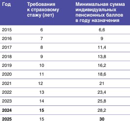 Баллы Наличие минимальной суммы индивидуальных пенсионных коэффициентов (баллов). Чтобы возникло право на страховую пенсию по старости, необходимо набрать определенную сумму баллов (в 2015 году – не ниже 6,6), значение которой будет также поэтапно увеличиваться