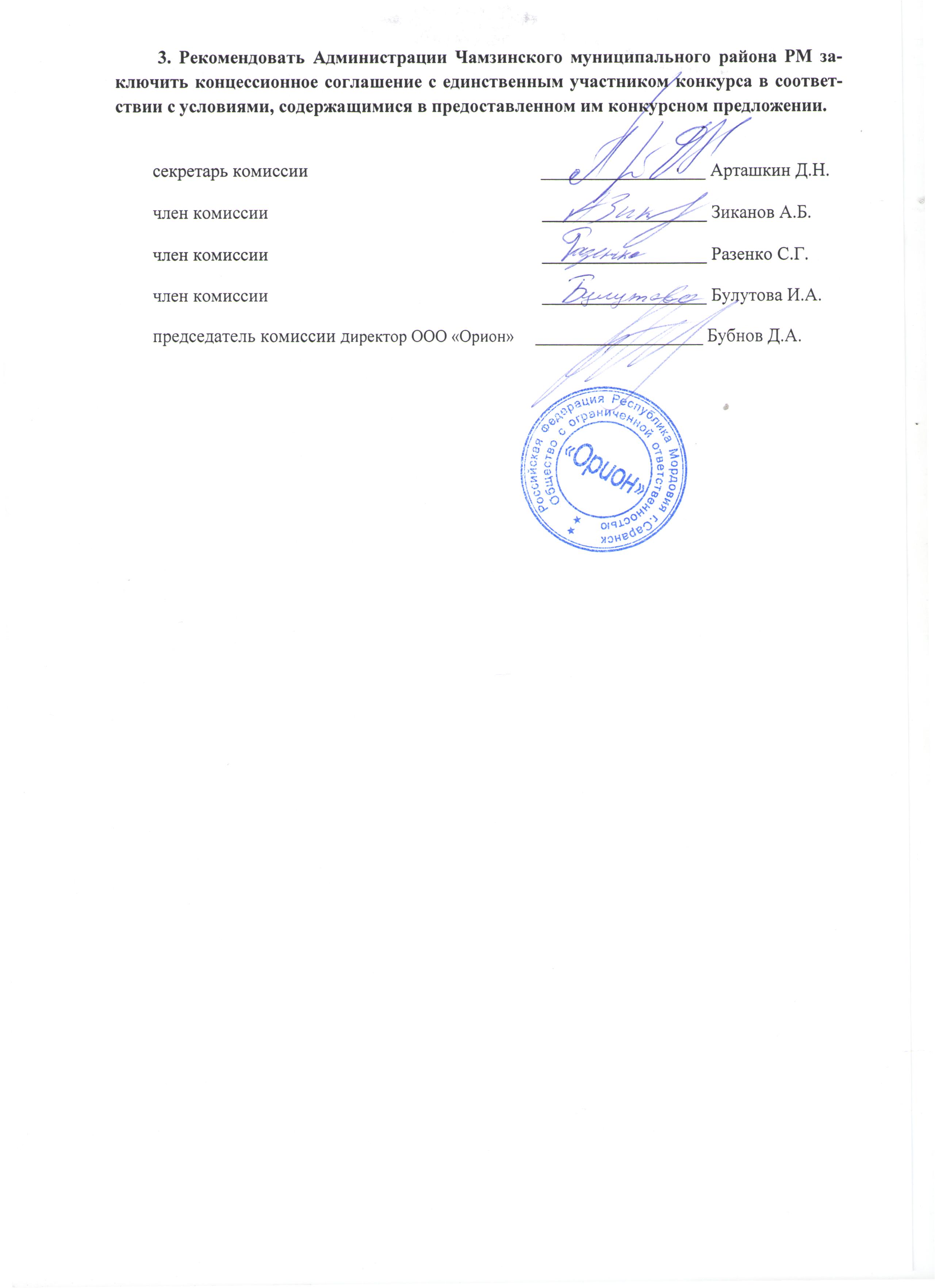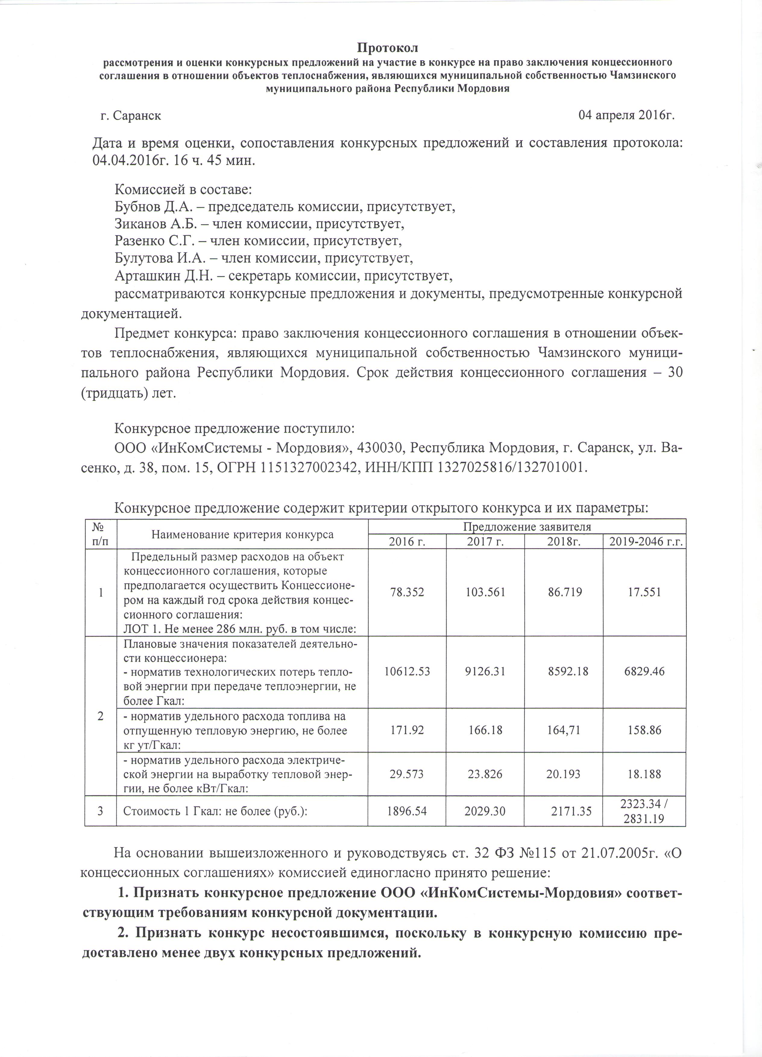 Протокол рассмотрения и оценки конкурсных предложений на участие в конкурсе на право заключения концессионного соглашения в отношении объектов теплоснабжения, являющихся муниципальной собственностью Чамзинского муниципального района Республики Мордовия, от 04 апреля 2016 года