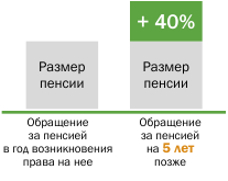 За каждый год более позднего обращения за назначением пенсии фиксированная выплата и страховая пенсия увеличиваются на определенные коэффициенты. Например, если вы обратитесь за страховой пенсией по старости через пять лет после возникновения права на нее, то общий размер пенсии (страховая пенсия и фиксированная выплата к ней) может быть примерно на 40% больше.