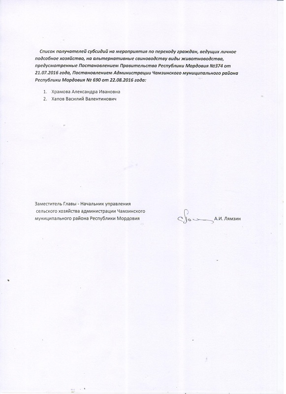 Список получателей субсидий на мероприятия по переходу граждан, ведущих личное подсобное хозяйство