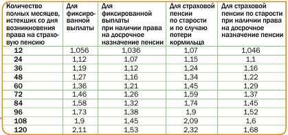 Повлиять на размер страховой пенсии по старости можно, если отложить выход на пенсию на год и более. За каждый год более позднего обращения за назначением пенсии и сама страховая пенсия, и фиксированная выплата увеличиваются на соответствующие премиальные коэффициенты. Размер премиального коэффициента зависит от условий права на страховую пенсию по старости на общих основаниях (по достижении общеустановленного пенсионного возраста 60 лет для мужчин и 55 лет для женщин) или досрочное назначение пенсии, т. е. до достижения общеустановленного пенсионного возраста.